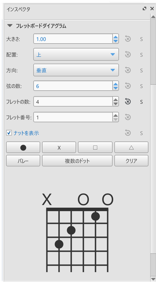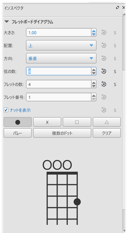 インスペクタの「▼フレットボードダイアグラム」の弦の数を[6]から[4]に変更し、ダイアグラムを「クリア」ボタンでクリアした後にウクレレのCコードを作成します。