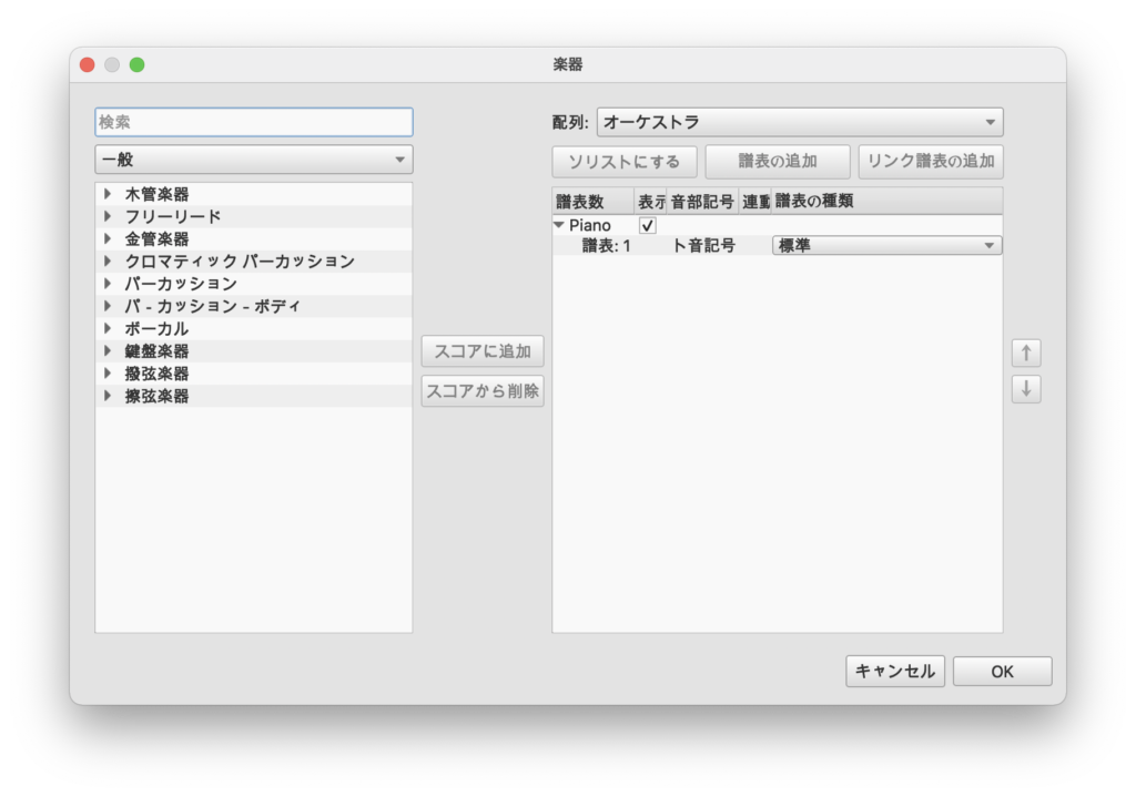メニューの「編集」-「楽器」をクリックして下記の楽器ダイアログを表示すると、配列:オーケストラでPianoの標準譜表が1つだけスコアに追加された状態になっています。