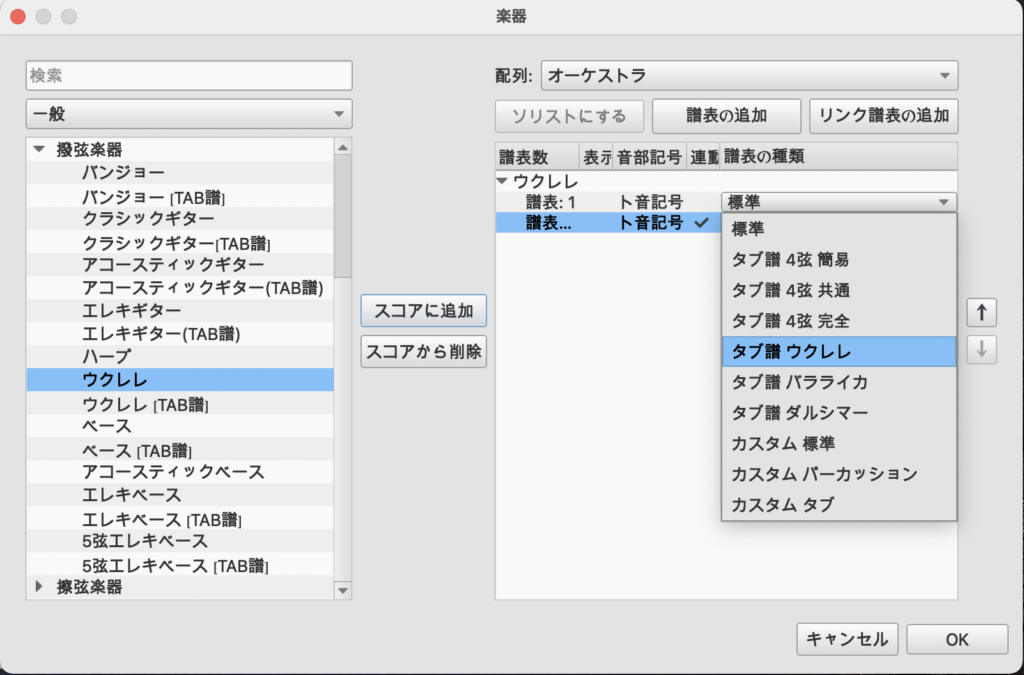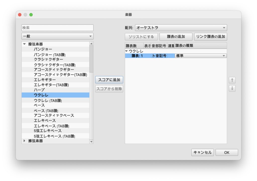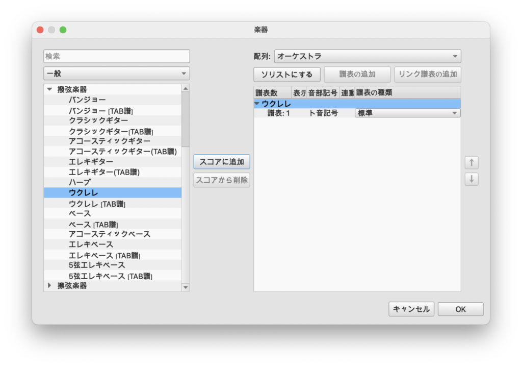 楽器ダイアログの左に表示されている「▶撥弦楽器」をクリックすると楽器名が表示されるので、「ウクレレ」を選択して「スコアに追加」ボタンでスコアに「▼ウクレレ」を追加します。