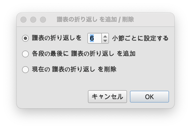 デフォルトの設定では、譜表の折り返しを4小節ごとに行う設定になっていますが、メニューの「フォーマット」-「譜表の折り返しを追加/削除」で表示されるダイアログで、譜表の折り返しを行う小節数を変更することが出来ます。