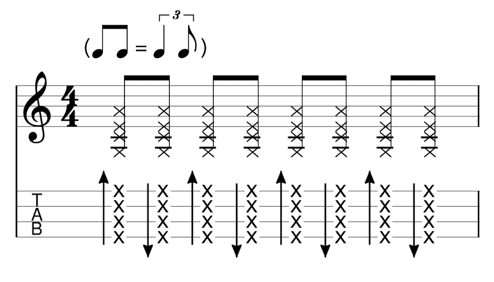 • 歌唱部分のメインストロークは、8分音符の3連スイングで弾きます。
