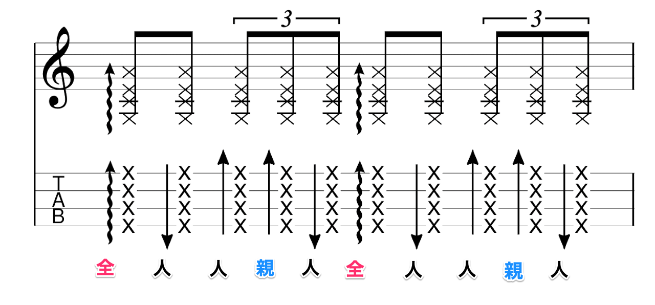 • イントロとエンディング部分のストロークでロール・ストローク(波↑全)とトリプル・ストローク(3連↑人↑親↑人)が使われています。ロール・ストローク(浪↑全)は、「小指→薬指→中指→人差し指→親指」の順番にと5本指すべてを使うダウンストロークです。トリプル・ストローク(3連↑人↑親↑人)は、3連符を「人差し指ダウン→親指ダウン→人差し指アップ」の順番でストロークします。(難しくて私には全然出来ないので、個別に練習中です。動画と合わせて弾くときは、今の所、人差し指のみで弾いてます。)