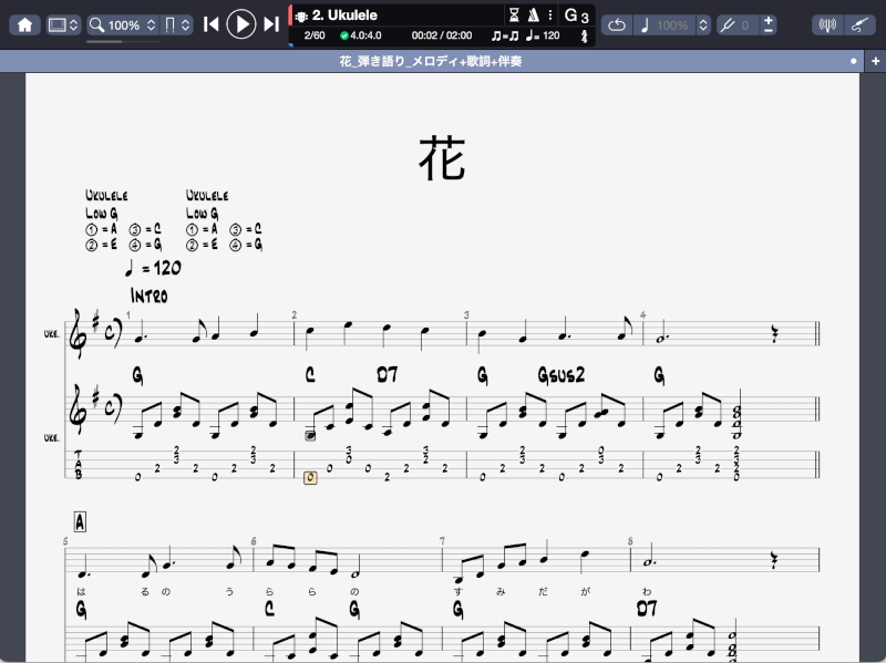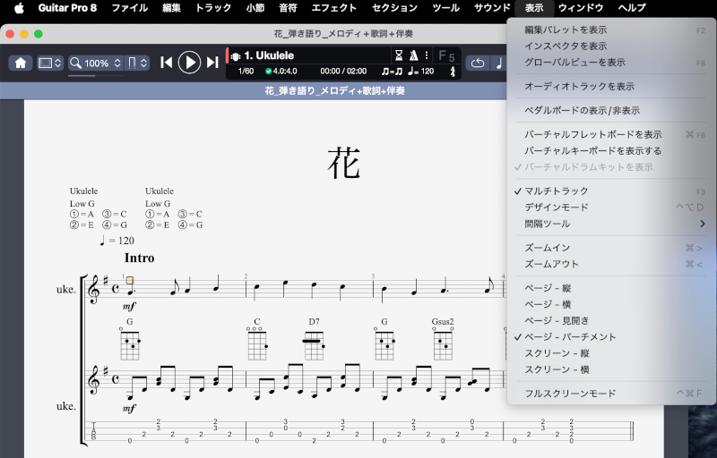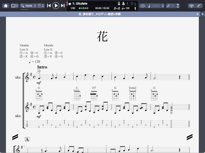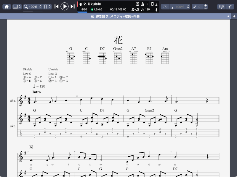 以前の記事「Guitar Pro 8で「早春賦」の「ウクレレ弾語り練習用楽譜」を作成してみた」の続編です。今回作成した「ウクレレ弾き語り練習用楽譜」は、日本の歌百選に選ばれている唱歌「花」と「春の小川」です。