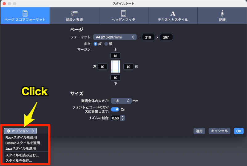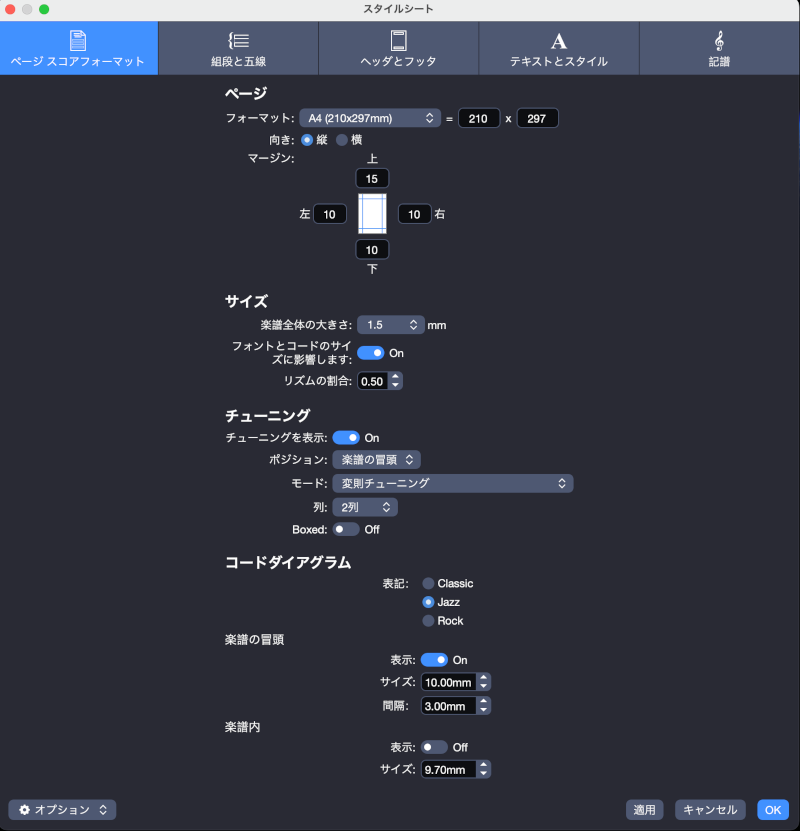 - 表示されたダイアログで、「ページのマージン」「楽譜全体の大きさ」「チューニングの表示/非表示」などをカスタマイズ設定することができます。
