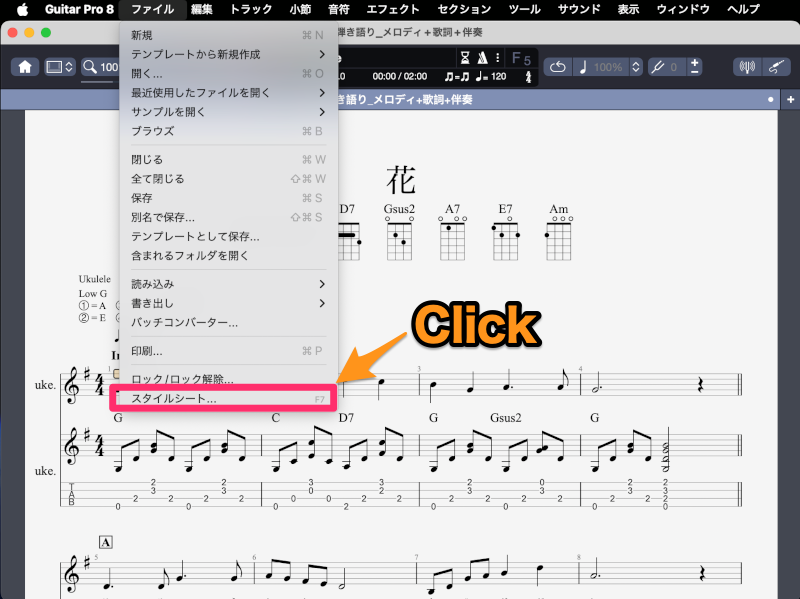 以前の記事では、備忘録として「ウクレレ弾語り練習用動画の作成手順」について書きました。今回の楽譜では、楽譜スタイルを変更して伴奏の上にコードダイアグラムを表示させました。なので、この記事では、「Guitar Pro 8の楽譜スタイル変更方法」を備忘録として残して置きます