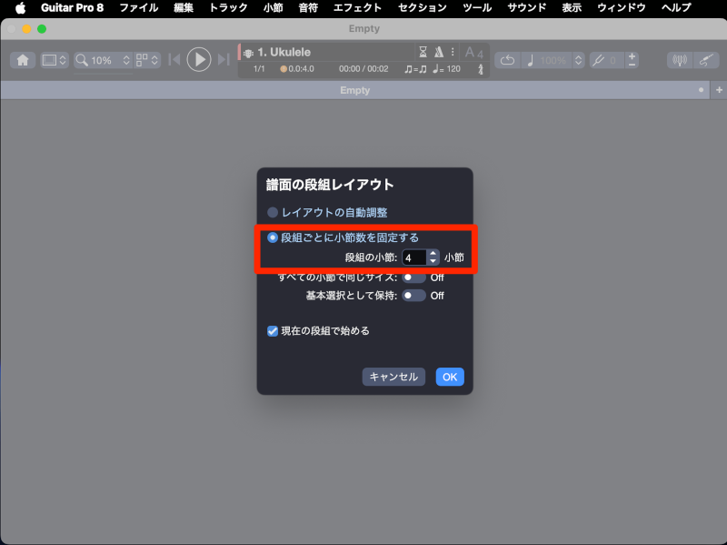 - >表示されたダイアログで、段落ごとに小節数を固定する数を設定します。変更選択した段落以降の段落に反映されます。今回、全段落を4小節に設定しました。